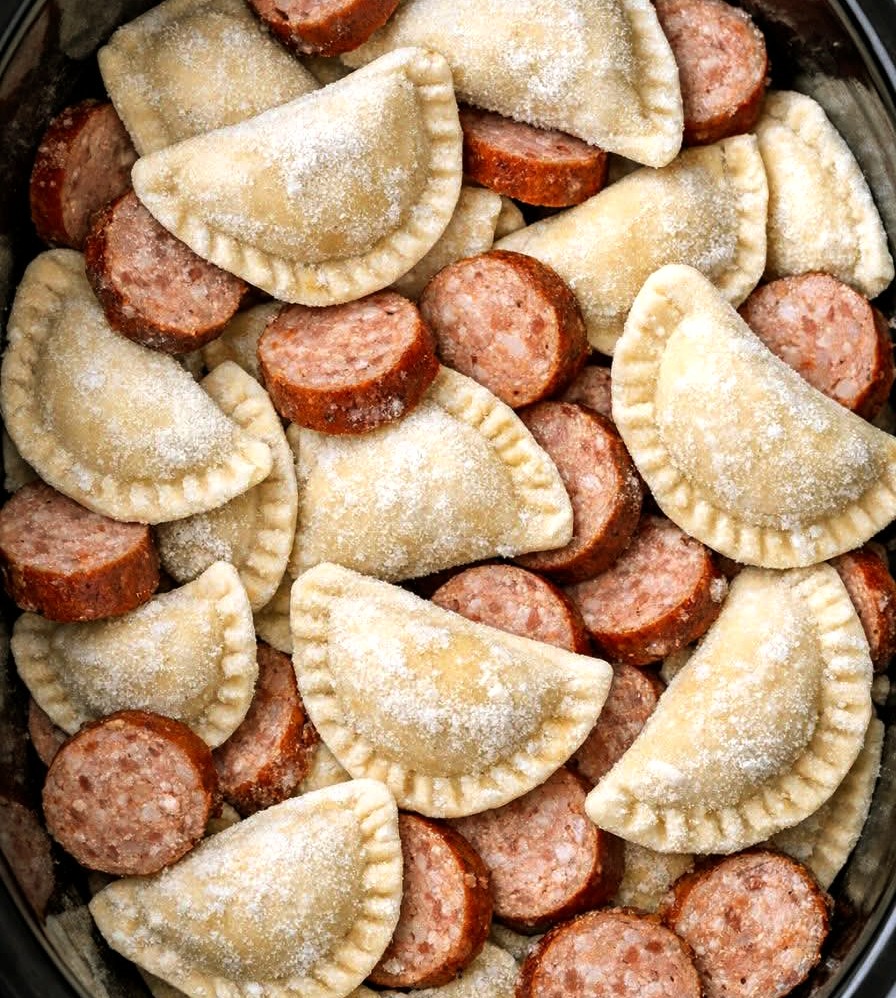 4-Ingredient Slow Cooker Sausage and Pierogies