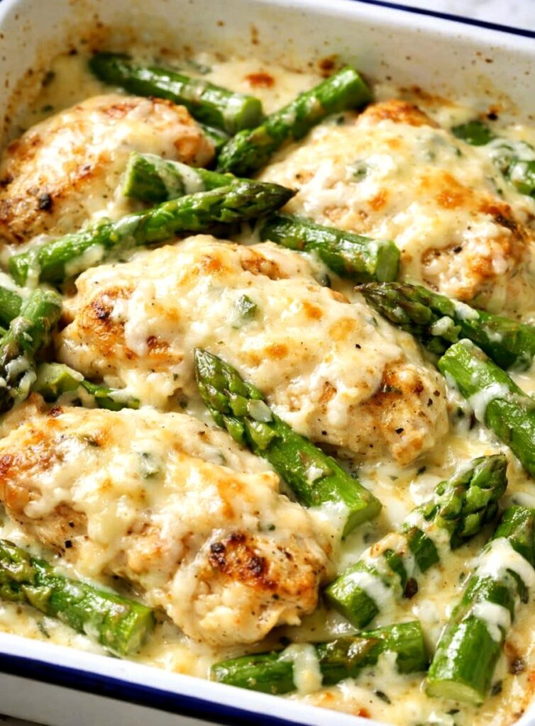 This 5-ingredient creamy asparagus chicken is a simple yet elegant spring dinner recipe that delivers restaurant-style flavor with almost no effort. Tender chicken thighs bake in a rich cream sauce while fresh asparagus cooks alongside, absorbing all the savory goodness. The result is a comforting one-pan chicken dinner that feels special enough for Sunday but easy enough for a busy weeknight.