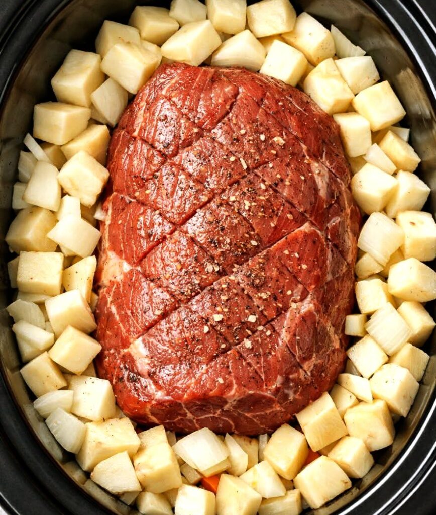 Arrange the chopped root vegetables in an even layer at the bottom of a large slow cooker. This creates a flavorful base and prevents the roast from sticking.