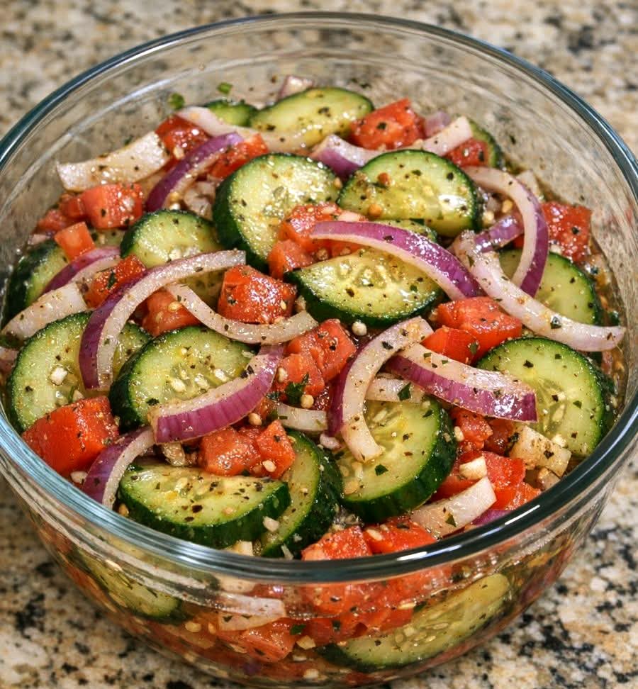 If you’re looking for a fresh, healthy cucumber tomato onion salad, this classic marinated version is a must-try! Crisp cucumbers, juicy tomatoes, and sweet onions soak in a perfectly balanced tangy-sweet vinaigrette, creating a refreshing side dish that even salad skeptics love.
