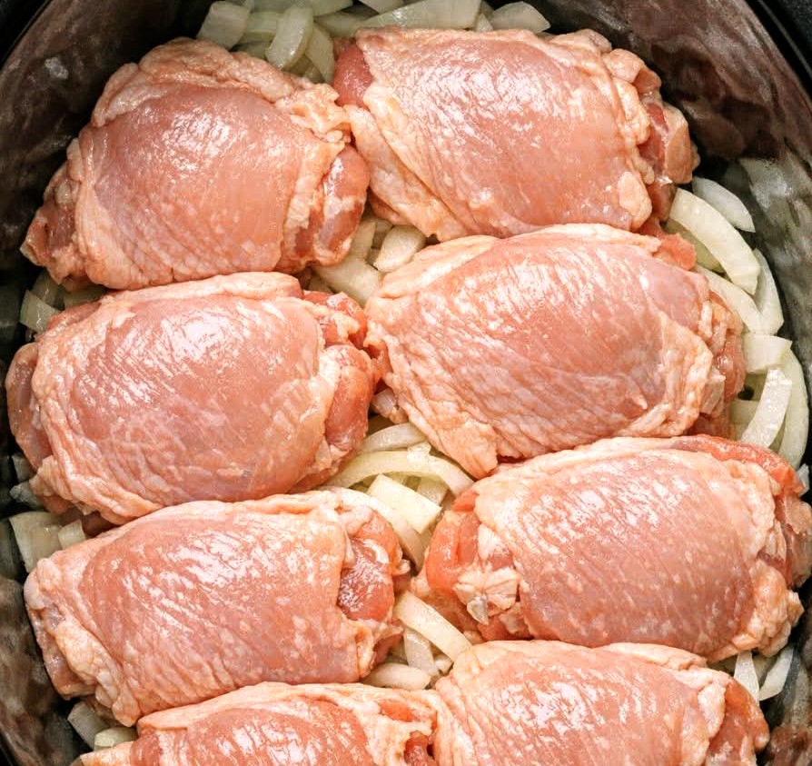 Place the chicken thighs over the onions in a single layer. Pour the chicken broth around the chicken—not directly on top.