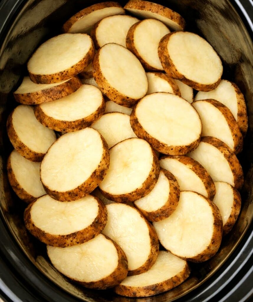 Arrange slices evenly in the slow cooker, slightly overlapping for even cooking.