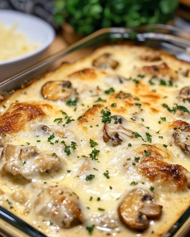 Creamy Garlic Mushroom Chicken Bake (Easy Cheesy Oven-Baked Chicken Recipe)