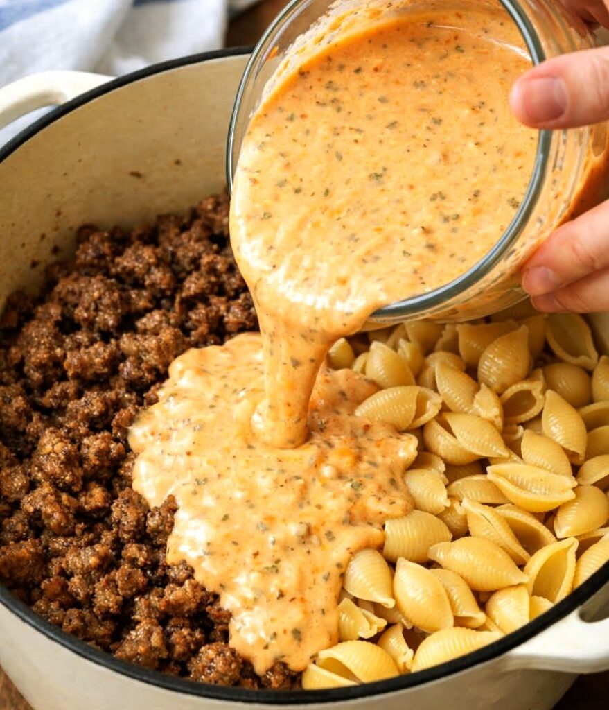 5. Cook together: Return Dutch oven to medium heat. Pour the creamy sauce over the pasta and beef. Gently press shells into the sauce. Bring to a gentle simmer, reduce heat to low, cover, and cook 15–18 minutes until pasta is tender.