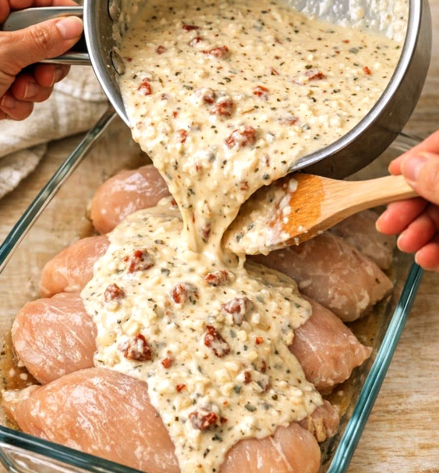 Creamy Sun-Dried Tomato Pour-Over Baked Chicken Breasts