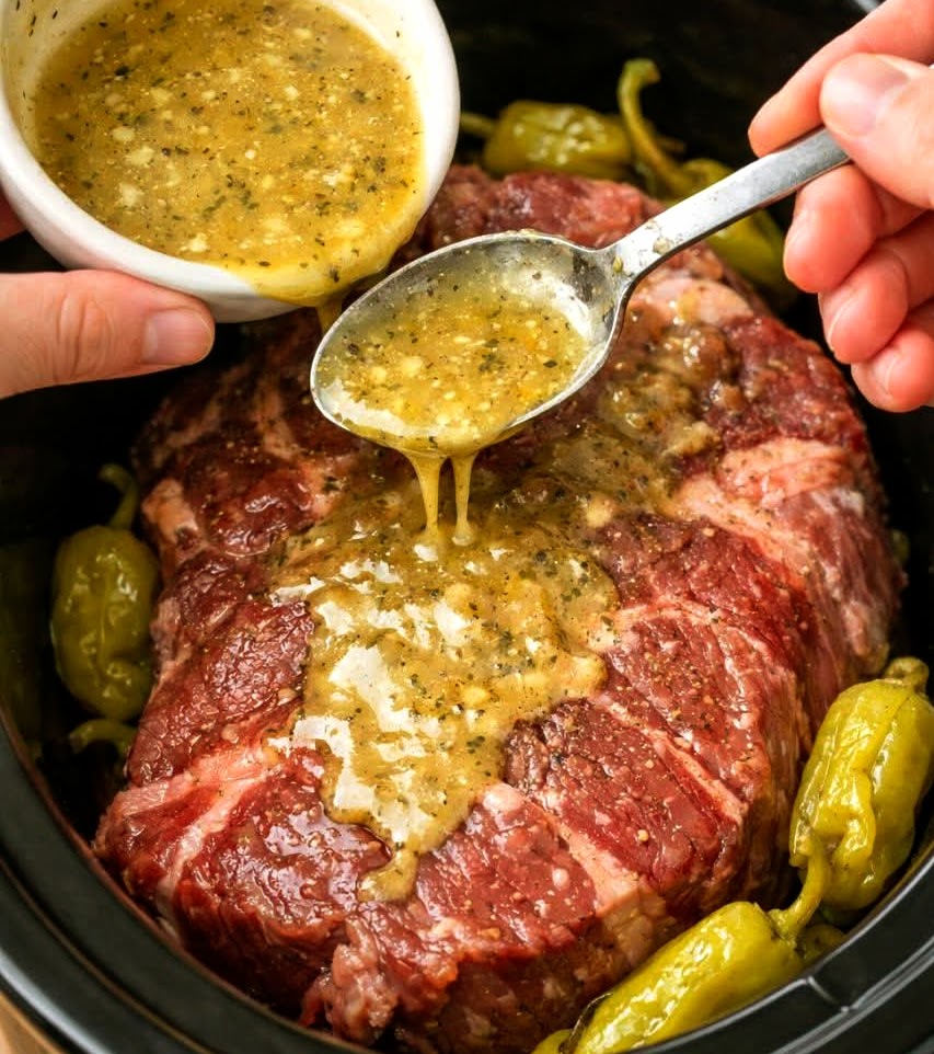 Originally popularized in Southern and Midwestern kitchens, this classic Mississippi pot roast recipe uses a simple seasoning blend of ranch mix, au jus gravy mix, butter, and tangy pepperoncini juice. Everything gets poured directly over a raw beef chuck roast, then the slow cooker works its magic. Hours later, you’re rewarded with fall-apart beef, drenched in a savory, buttery gravy with just the right zip.