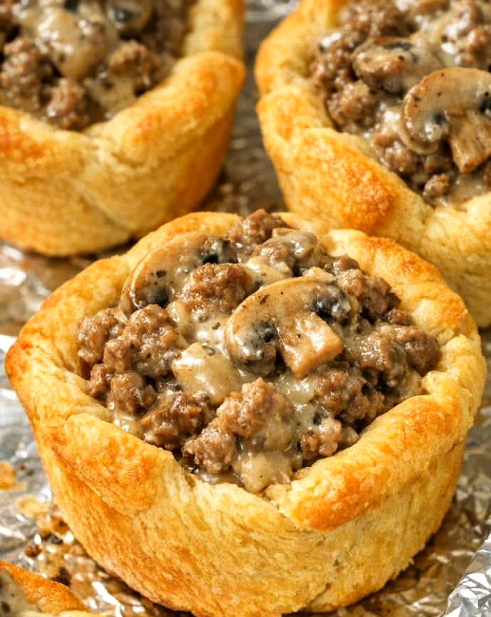 They bake up golden and buttery, with a rich creamy beef and mushroom filling that tastes like a mini casserole in every bite!