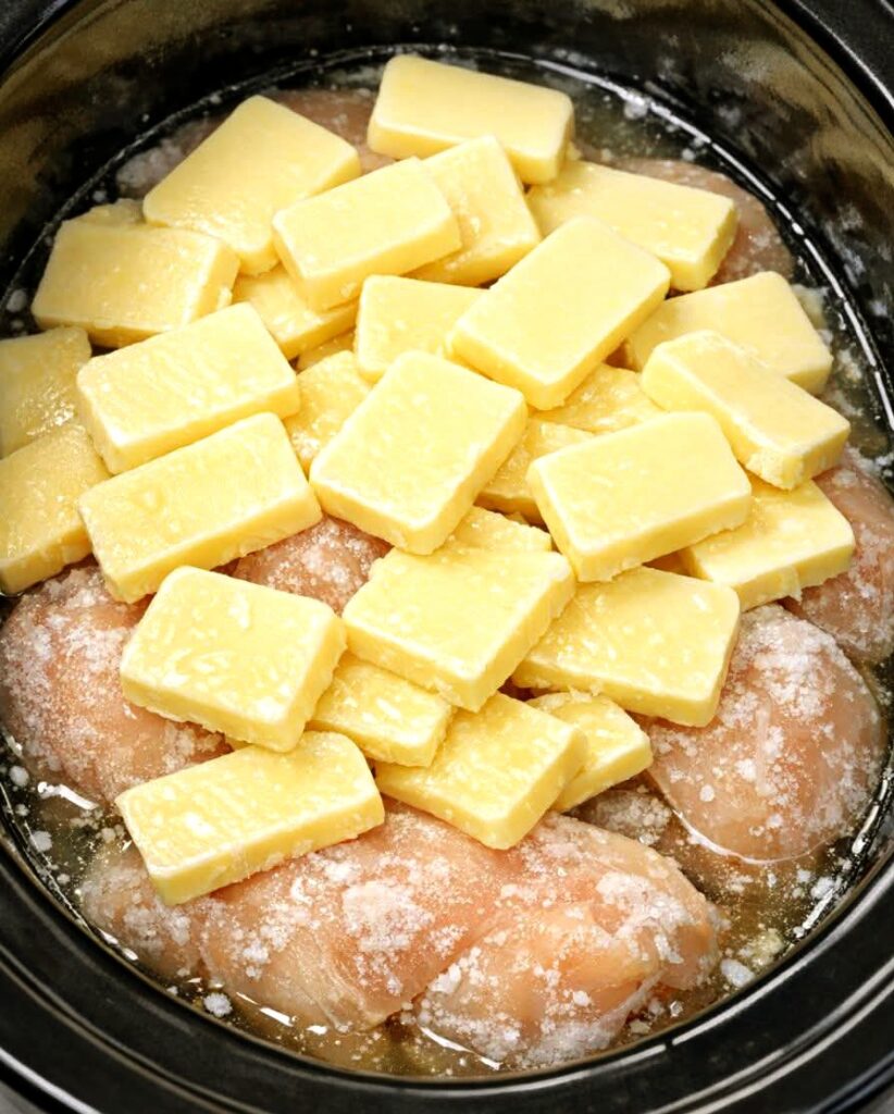 Place the frozen boneless skinless chicken breasts in an even layer at the bottom of a 4- to 6-quart slow cooker. Avoid stacking too much so they cook evenly.