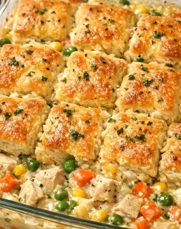 Serve warm and enjoy every spoonful of this delicious homestyle chicken pot pie bake.