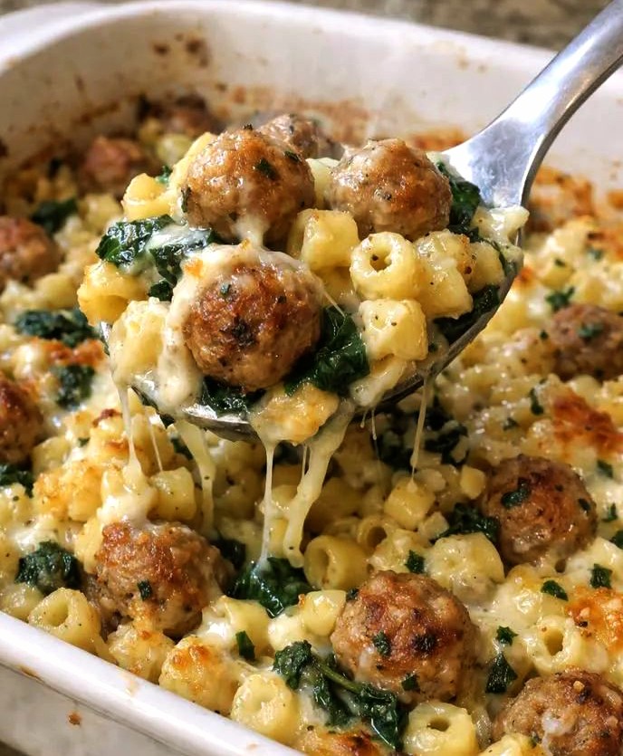 - Bake for 35–40 minutes until pasta is soft and meatballs are heated through.