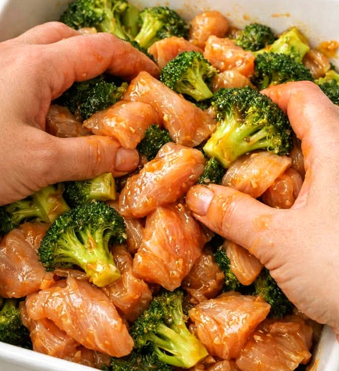 Add chicken: Arrange seasoned chicken over the broccoli in a single layer.