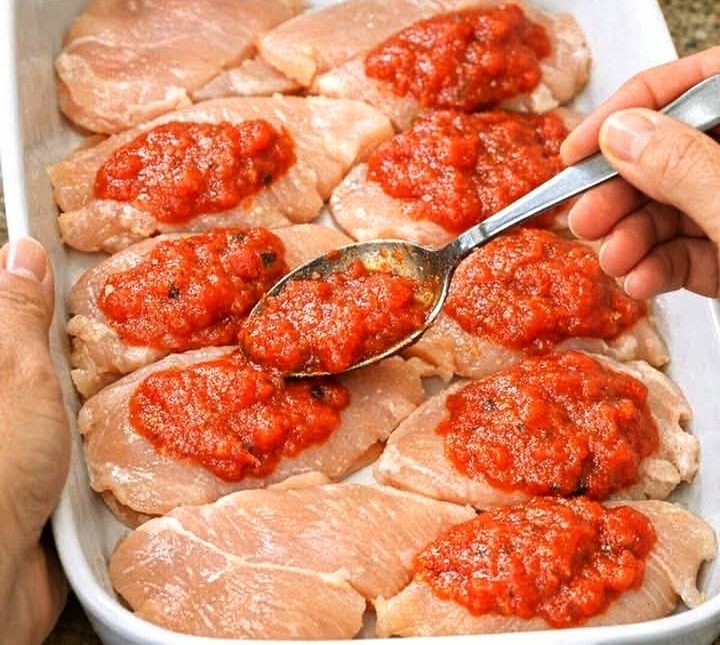Arrange chicken in the baking dish. Drizzle with olive oil and season with salt and pepper. - Add Marinara Sauce