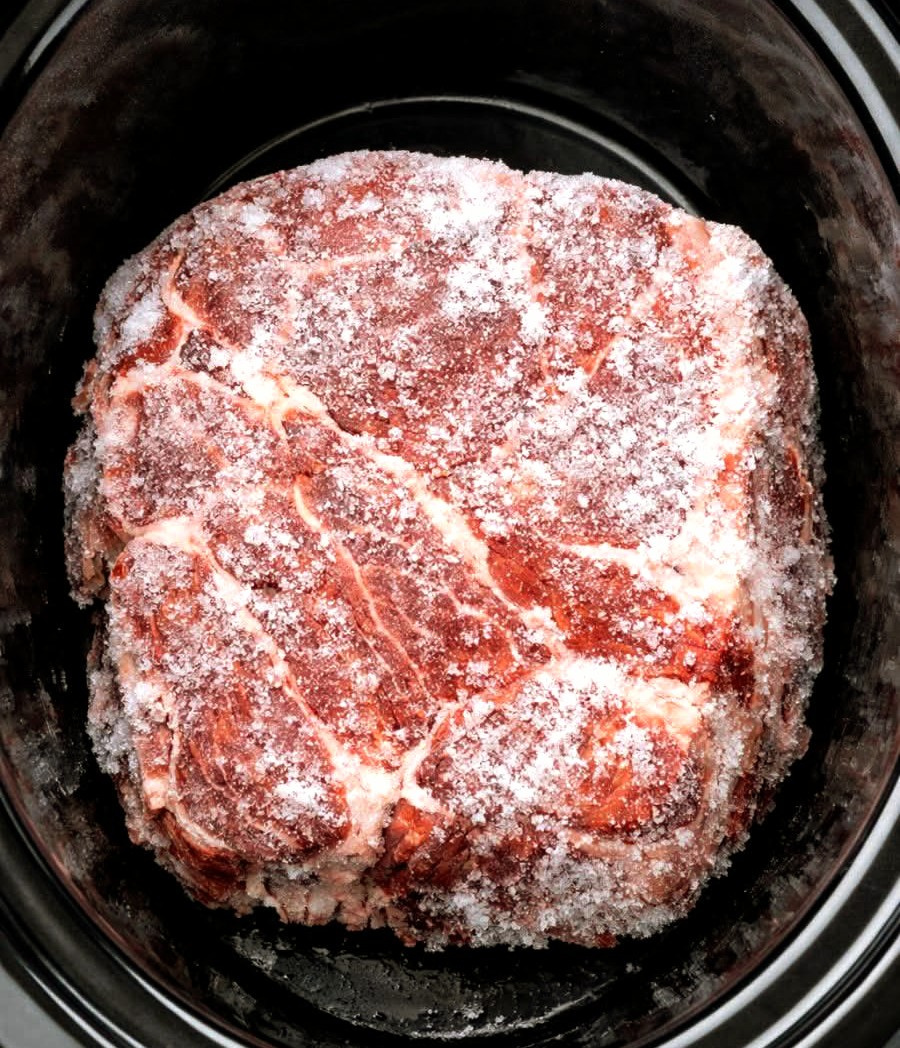 Place the completely frozen chuck roast into your slow cooker (no thawing required).