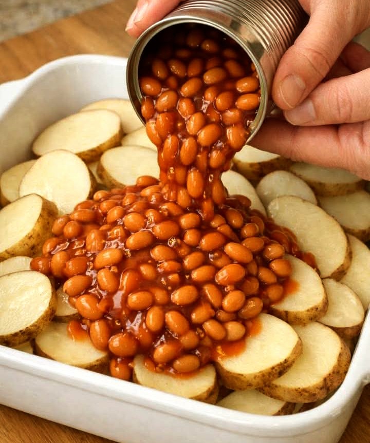 Open the canned baked beans and stir briefly to loosen the sauce. Pour the beans evenly over the potatoes, spreading them gently so they cover the entire surface.
