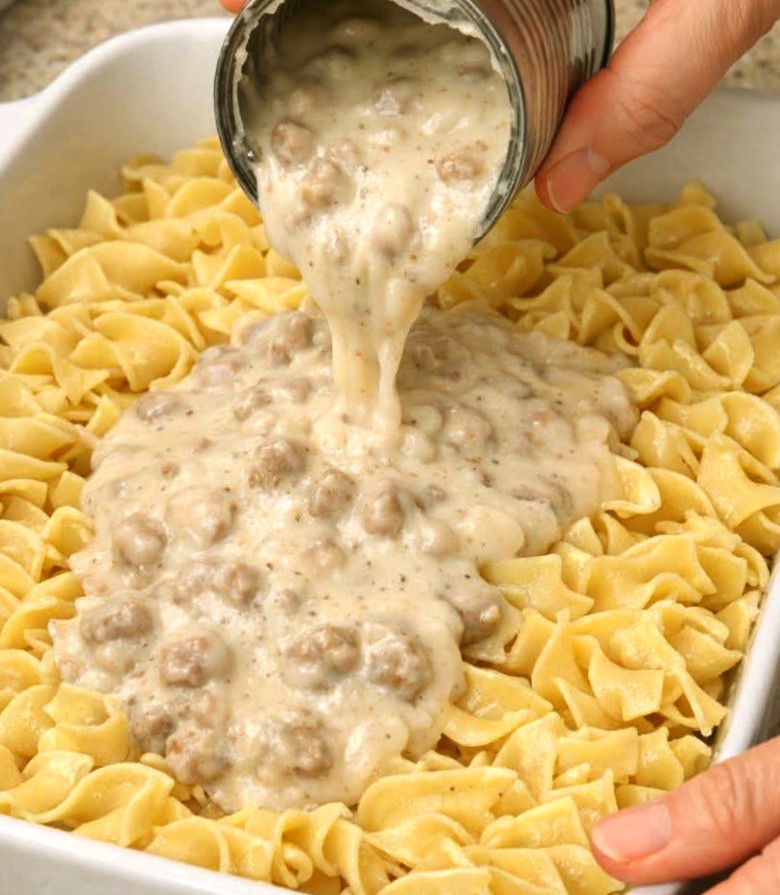 This Amish-style sausage gravy noodle casserole is a true easy weeknight dinner recipe made with simple pantry ingredients. With just canned sausage gravy, egg noodles, chicken broth, and cheese, you get a rich, creamy, oven-baked meal that delivers classic Midwestern comfort food flavor with minimal effort.