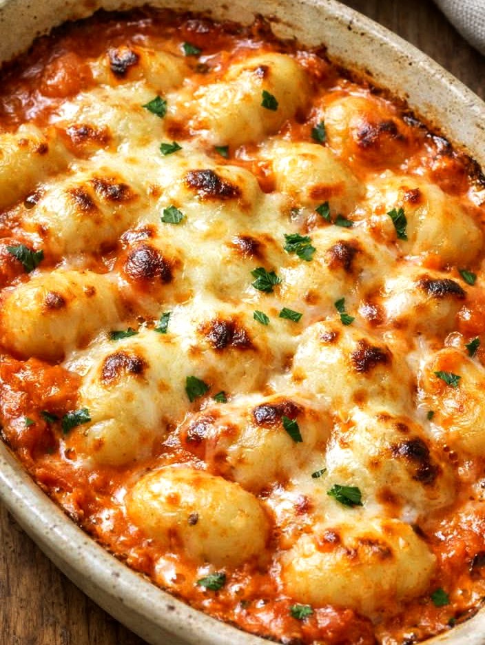 This easy baked creamy tomato gnocchi is the ultimate comfort food casserole made with just 4 simple ingredients. Soft, pillowy potato gnocchi bake directly in a rich creamy tomato sauce and get finished with a golden layer of melted mozzarella cheese.