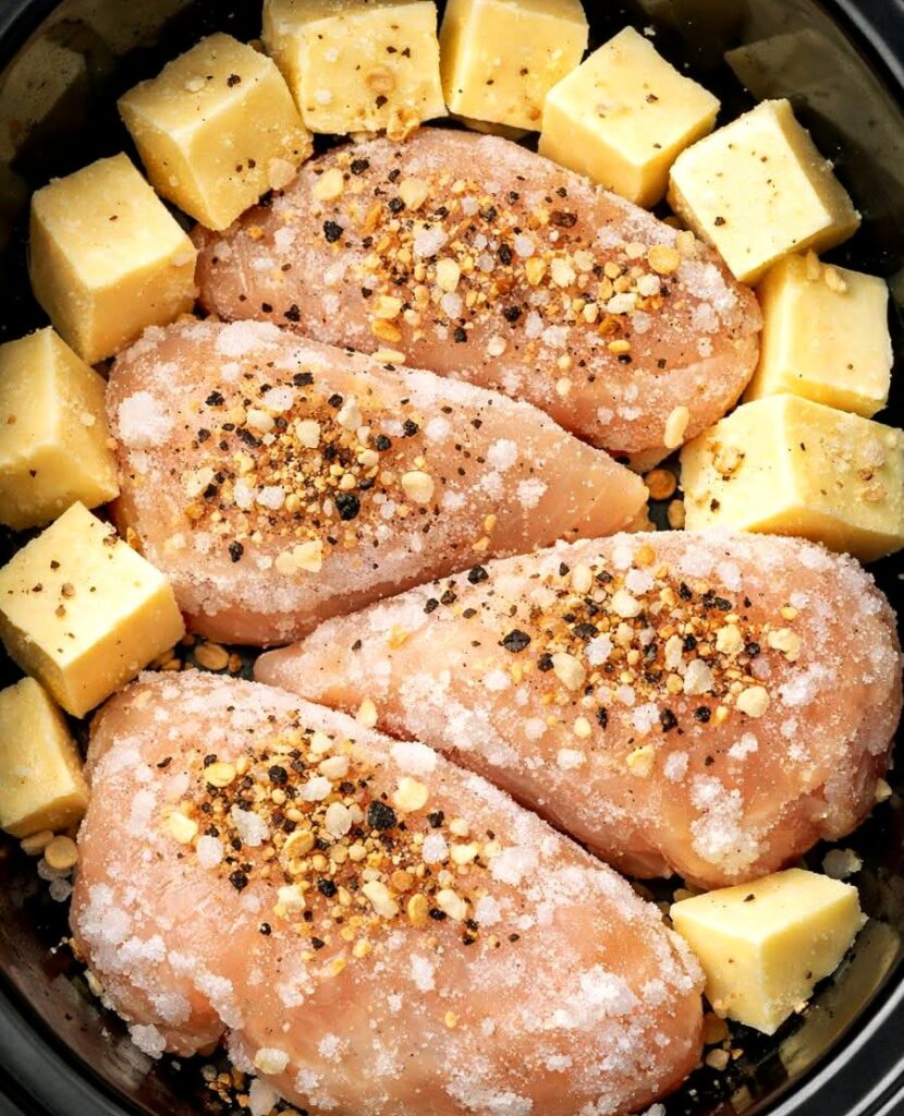 - Place the frozen chicken breasts in a single layer in your slow cooker.