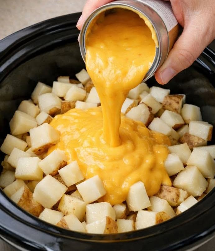 Place the cubed russet potatoes evenly in the slow cooker. - Make the creamy cheese sauce