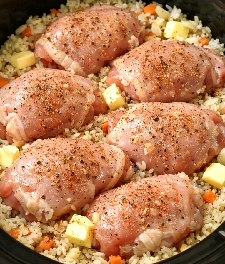 Cover and cook on LOW for 4–5 hours, or until the chicken is tender and the rice is soft and creamy. Avoid lifting the lid during the first few hours so the rice cooks evenly.