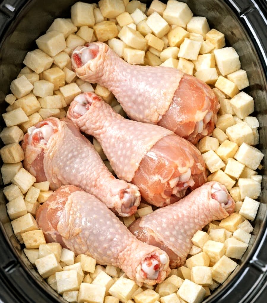 Add potatoes and onions to the bottom, then place the chicken drumsticks on top.