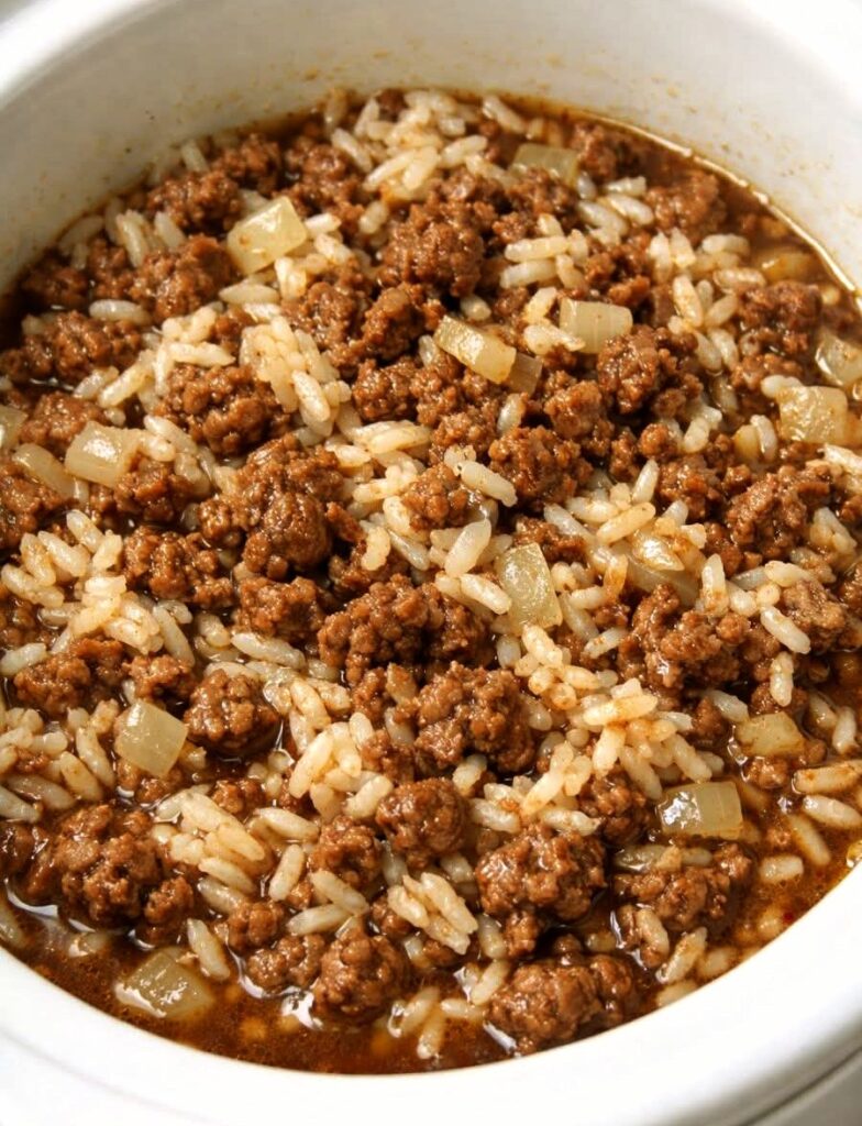 - Layer Ingredients in Slow Cooker: Add browned beef to the slow cooker. Spread diced onion evenly on top, then add the rinsed rice. Pour the beef broth over all, pressing down any rice grains that float.