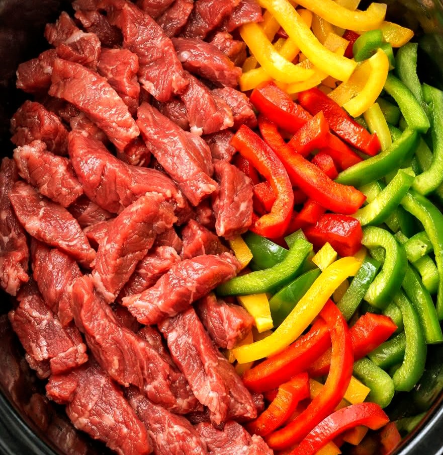 Add the bell peppers and onion on top of the beef.