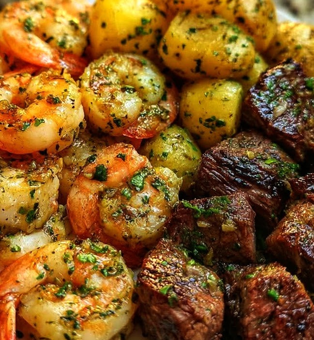 Garlic Butter Shrimp & Steak Bites with Crispy Veggie Potatoes