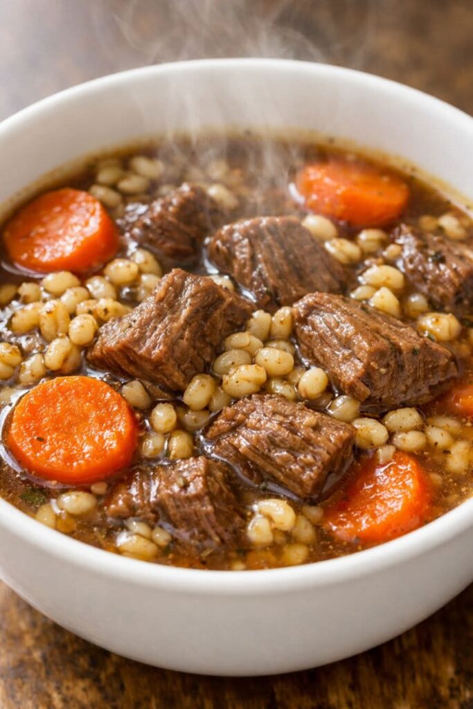 This Slow Cooker Beef and Barley Stew is a classic comfort food recipe that’s both simple and nourishing. Made with just **four wholesome ingredients—beef stew meat, pearl barley, carrots, and beef broth—**this easy crockpot beef barley soup slowly cooks into a rich, hearty meal with tender beef, plump barley, and naturally sweet carrots.