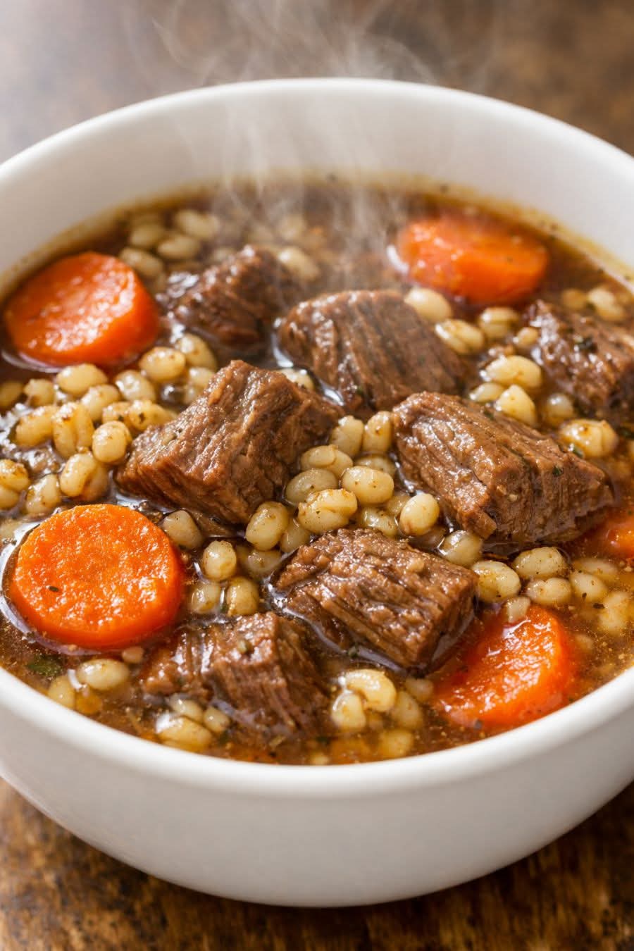 The stew is ready when the beef is fork-tender, the barley is fully cooked, and the carrots are soft but still hold their shape.