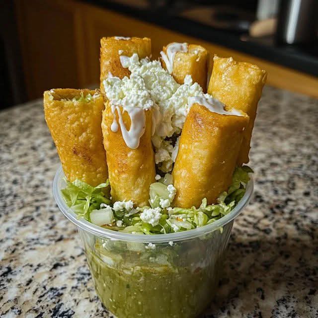Crispy Rolled Tacos Drowned in Zesty Green Sauce