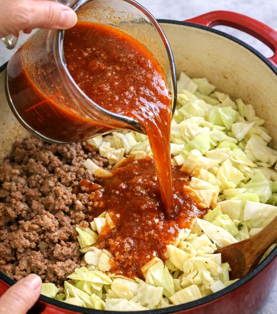 Pour the sauce evenly over the cabbage and beef mixture, letting it seep into the layers.