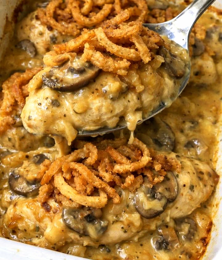 If you’re looking for the ultimate comfort food dinner, this Oven-Baked 4-Ingredient Chicken Royale is a must-try. This classic creamy chicken casserole recipe is rich, satisfying, and made with simple pantry staples. Tender chicken breasts are baked in a savory golden mushroom sauce, topped with crispy fried onions for the perfect crunchy finish.