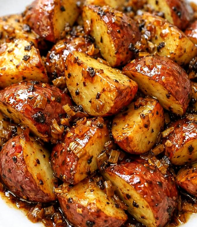 Once fork-tender and glossy, spoon the potatoes onto a serving dish and drizzle with the rich onion butter sauce.