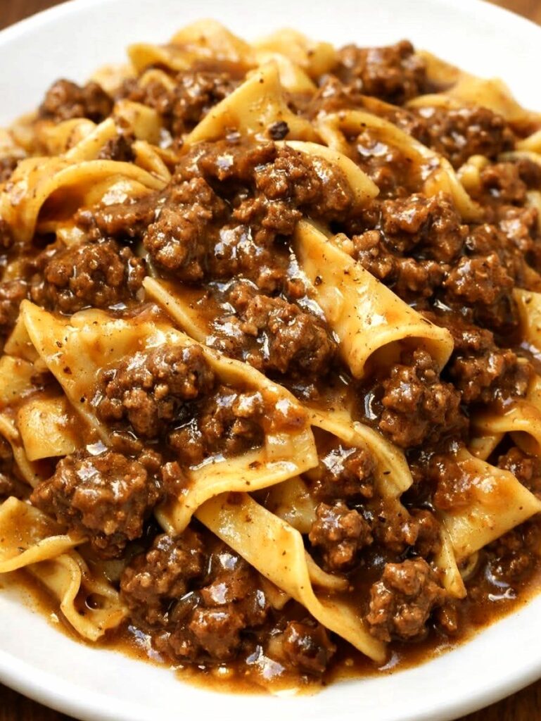Think tender egg noodles coated in savory beef gravy, combined with seasoned ground beef for a classic Midwestern comfort food experience. This is the kind of budget-friendly crockpot recipe that turns basic pantry staples into a filling, satisfying dinner everyone will love.