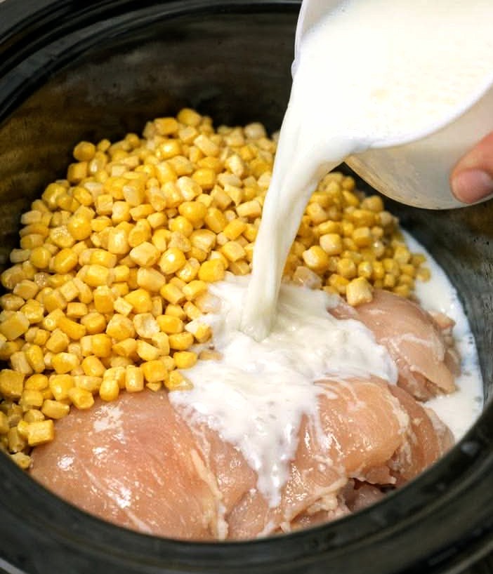 Shred the chicken directly in the slow cooker with two forks or on a cutting board, then return it to the pot. Stir to combine with the creamy broth and corn.
