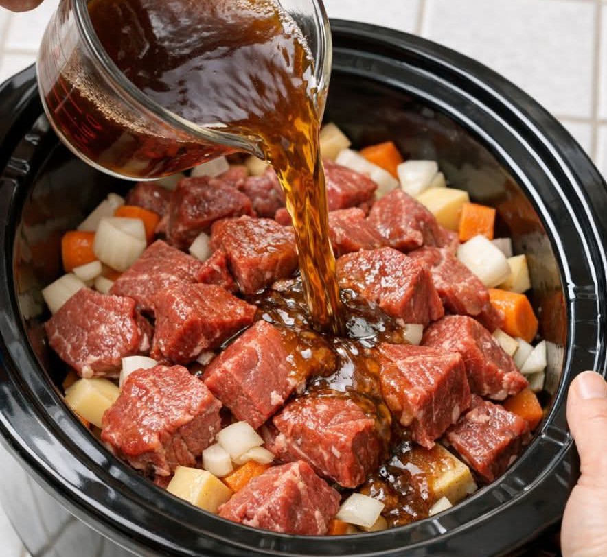 Slowly pour beef broth over all ingredients, ensuring everything is covered. Press down gently any ingredients poking above the liquid. - Cook Low & Slow:
