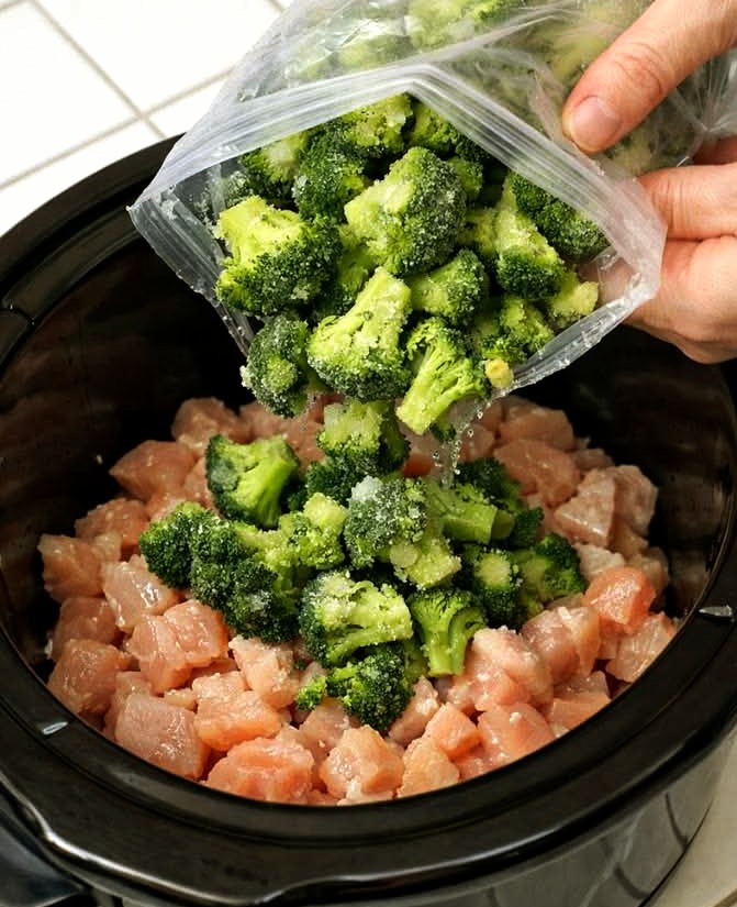 1. Layer Chicken and Broccoli: Place raw diced chicken evenly in a 5-6 quart slow cooker. Top with frozen broccoli florets without stirring.