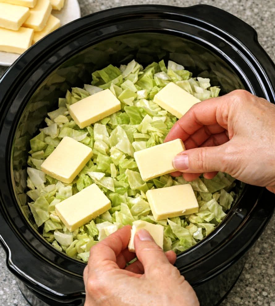 - Add butter: Lay butter slices evenly over the cabbage for rich, buttery pockets throughout.