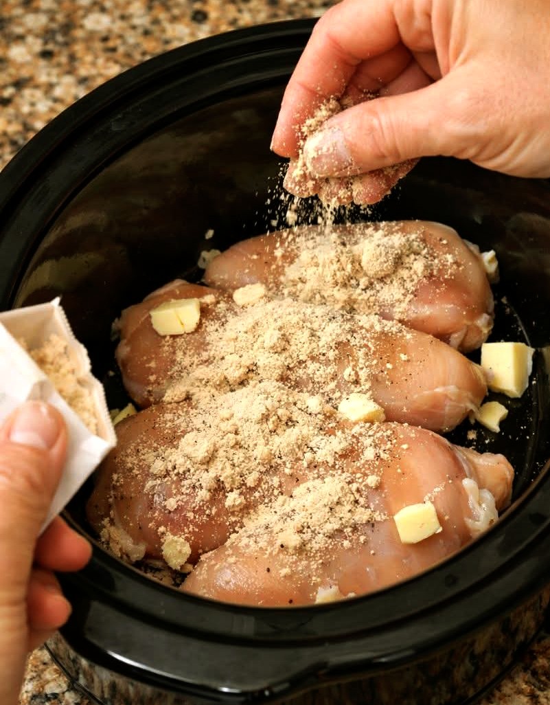 Place the raw chicken breasts in a single layer at the bottom of a 4–6 quart slow cooker.