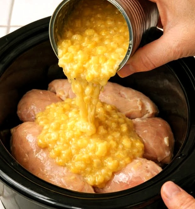 Add corn & broth: Pour the cream style corn evenly over the chicken, then add chicken broth. Sprinkle with salt and pepper.