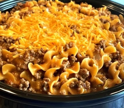 Slow Cooker Amish Egg Noodle Casserole made with ground beef, creamy soups, and cheddar cheese. An easy, comforting family dinner recipe.