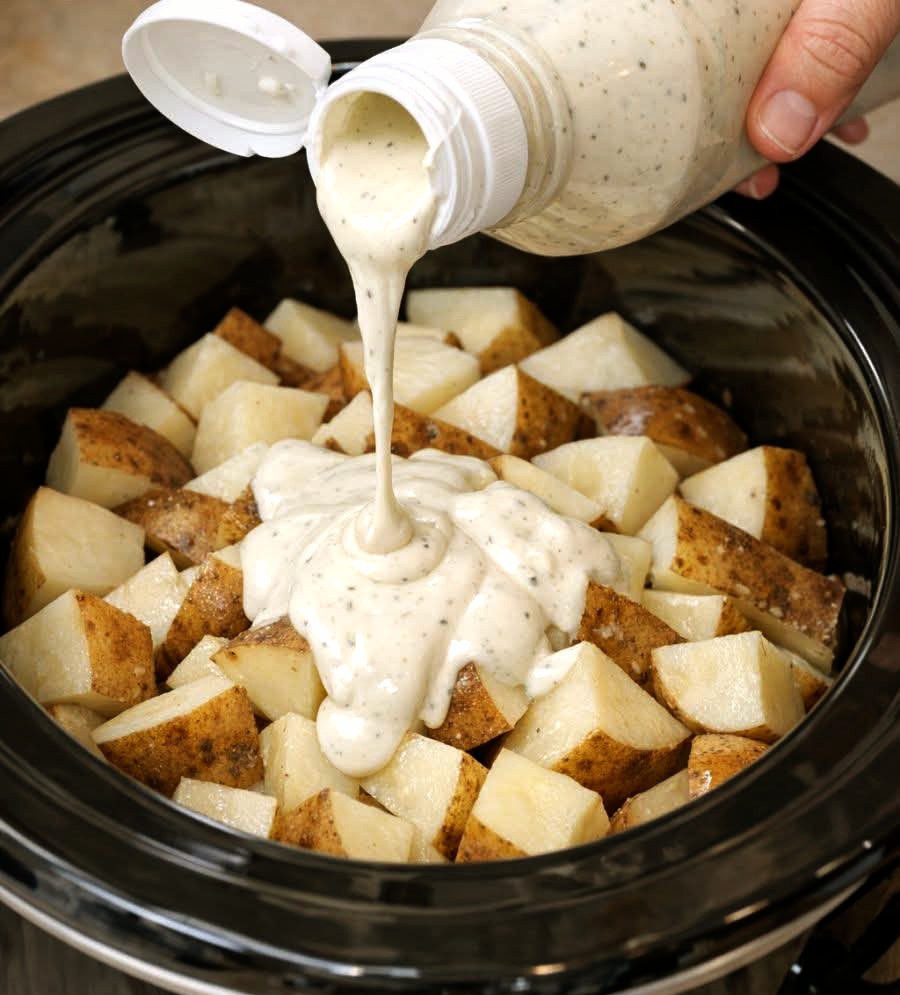 Pour ranch: Slowly pour the bottled ranch dressing over the potatoes, covering as much surface as possible.