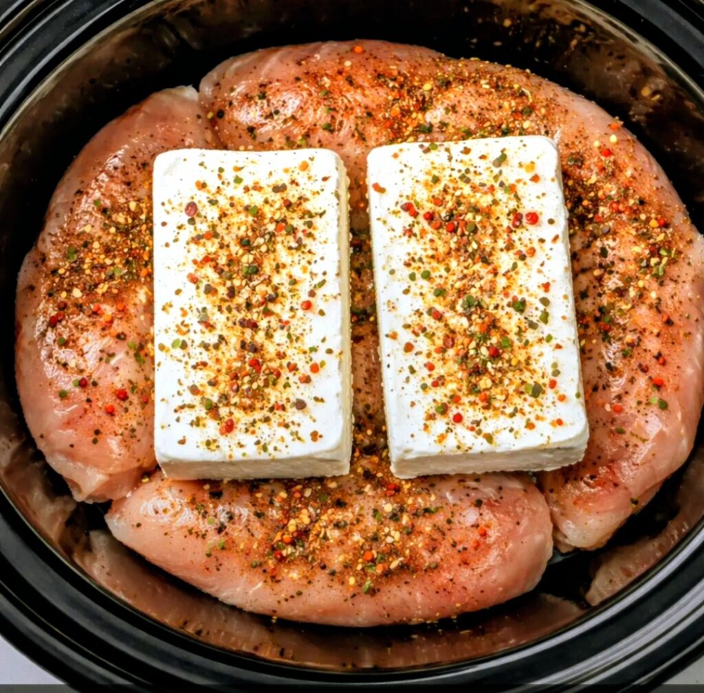 Add cream cheese (whole or cubed) on top of the chicken.