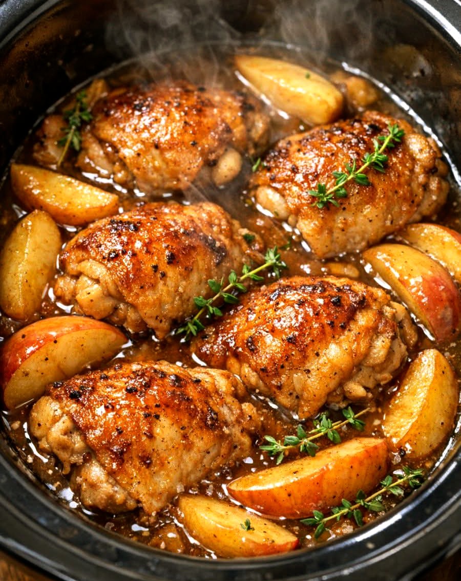 If you’re searching for an easy slow cooker chicken recipe that delivers comforting fall flavors with minimal effort, this Slow Cooker Apple Cider Chicken is a must-try. Made with only four simple ingredients, this sweet and savory crockpot chicken combines tender chicken thighs, fresh apples, apple cider, and apple cider barbecue sauce for a rich, glossy glaze that tastes like autumn in every bite.