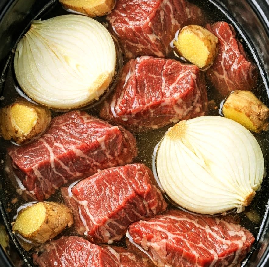 Place beef cubes directly into the slow cooker (searing is optional for deeper flavor).