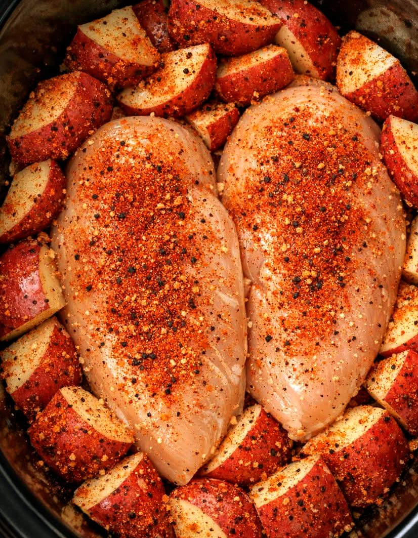 Cover and cook on LOW for 5–6 hours or HIGH for 2½–3 hours, until the chicken reaches 165°F and the potatoes are fork-tender.