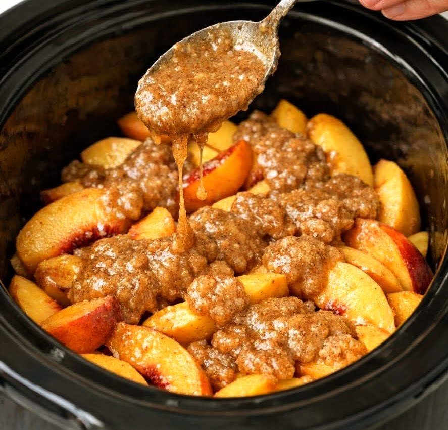 With just a few pantry staples and about 10 minutes of prep, you can create a gooey, buttery peach dessert that fills your home with the smell of warm cinnamon and caramel while the slow cooker does all the work. No mixing bowls piled high, no oven required, and no complicated steps just layer, drizzle, and walk away.