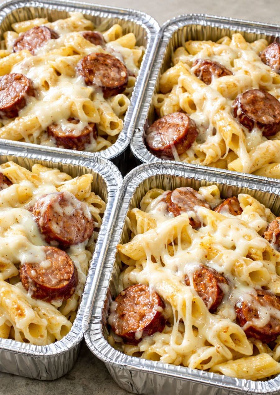 Divide uncooked penne evenly between trays. Top with sliced smoked sausage, mixing slightly so flavors distribute evenly.