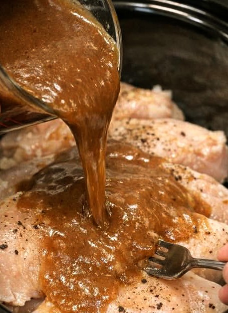 Arrange the chicken in an even layer in the bottom of your slow cooker.