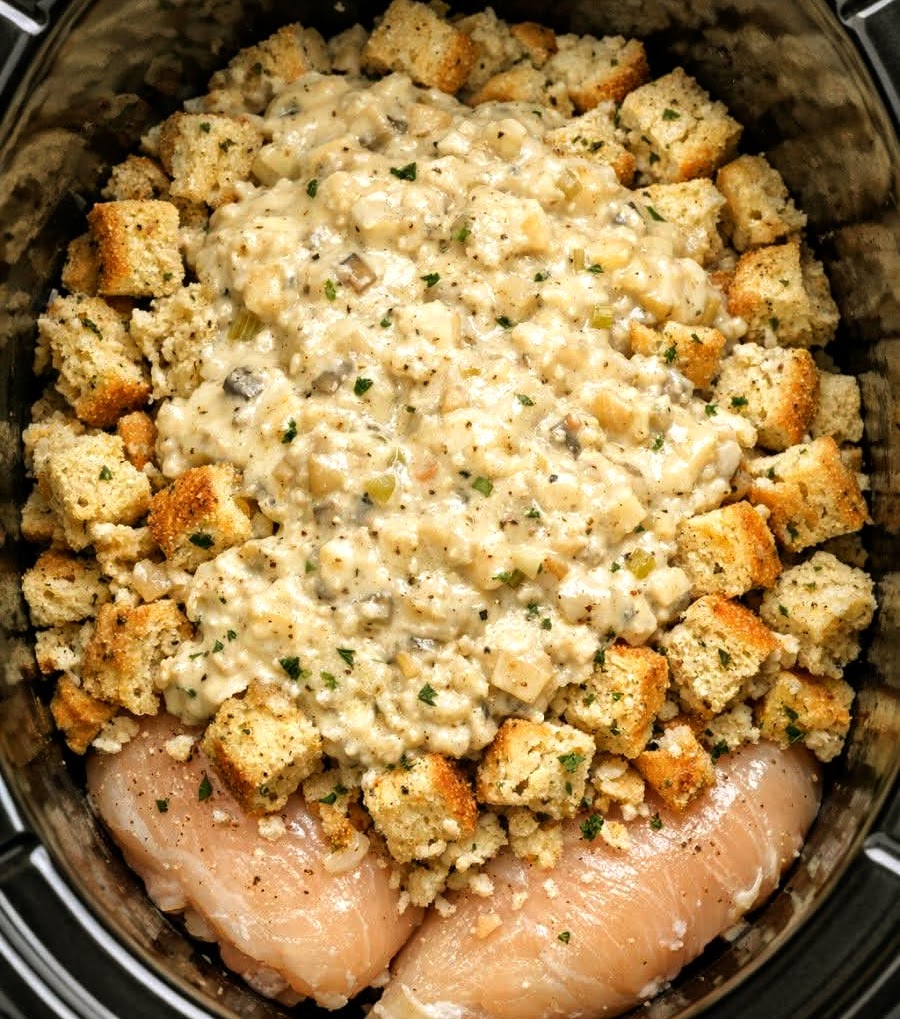 Tender chicken breasts slowly cook in a creamy gravy while classic boxed stuffing steams on top, soaking up all that savory flavor. It’s the kind of dump-and-go crockpot recipe that tastes like you cooked all day yet takes only minutes to assemble.